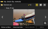 Inserte el dispositivo de memoria USB en la máquina, y en la pantalla [Inicio], pulse [Imp. desde disp. de mem.] para mostrar los archivos y carpetas del dispositivo de memoria USB.