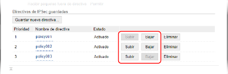 Haga clic en [Subir] o en [Bajar] a la derecha del nombre de directiva para establecer la prioridad. Las directivas de nivel superior tienen prioridad en la comunicación IPSec.