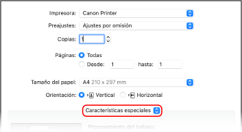 2 | En el menú emergente de opciones de impresión, seleccione [Características especiales]. Si no aparecen las opciones de impresión, haga clic en [Mostrar detalles] en el cuadro de diálogo de impresión. |