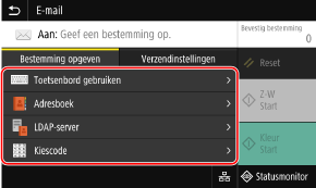 Als de bestemming bij het verzenden onderhevig is aan beperkingen als gevolg van de Functie Verificatie-instellingen voor Verzenden, kunt u geen andere bestemming opgeven. Voor details neemt u contact op met de beheerder.