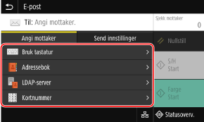 Hvis mottakeren ved sending er begrenset på grunn av godkjenningsinnstillingene for send-funksjonen, kan du ikke angi en annen mottaker. Kontakt administrator hvis du trenger mer informasjon.