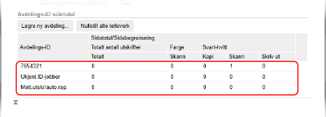 Du kan vise antall sider som er skrevet ut og kopiert for hver Avdelings-ID når Administrere Avdelings-ID er aktivert.