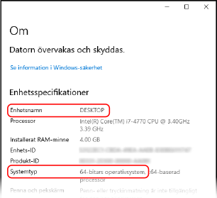 I [Enhetsspecifikationer] kan du se datorns namn och versionen av operativsystemet.