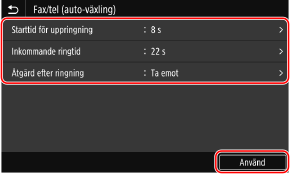 Ange tiden för ringsignalen och åtgärder när ett fax tas emot. Tryck sedan på [Använd].