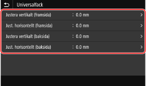 Du kan ange justeringsriktning och bredd för varje papperskälla och utskriftssida (fram- och baksidan).