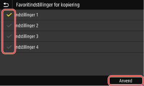 Vælg afkrydsningsfelterne for de indstillinger, som du vil tildele som genvejsknapper, og tryk på [Anvend].
