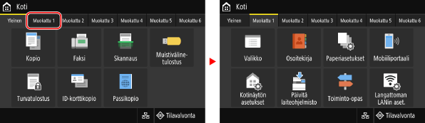 Kosketa näyttöä ja pyyhkäise sormenpäällä. Näyttö liikkuu pyyhkäisemääsi suuntaan. Esimerkiksi [Koti]-näyttö siirtyy pyyhkäisysuunnassa olevaan välilehteen.