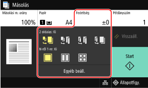 Az alapvető másolási beállítások mellett a készüléken kétoldalas másolásra, a képminőség módosítására, valamint az adott eredeti dokumentumnak és célnak megfelelő további beállítások konfigurálására is lehetőség van. Ezeket a beállításokat a másolási képernyőn konfigurálhatja.