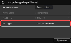 Нажмите [Настройки] [Сеть] [Настройки драйвера Ethernet].