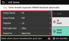 Bu ayarlar, taranan verileri bir USB bellek cihazına kaydetmeye imkan tanır. Taranan Verileri Bir USB Bellek Cihazına Kaydetme Hazırlığı