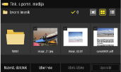 V napravo vstavite pomnilniško napravo USB, nato pa na zaslonu [Domov] pritisnite [Tiskanje s pomn. medija], da prikažete datoteke in mape v pomnilniški napravi USB.
