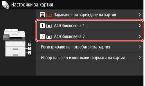 По подразбиране размерът и типът на хартията са зададени на A4 и Обикновена 2. Когато се зарежда хартия с различен размер или тип, променете настройките на хартията.