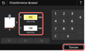 2 | Въведете стойностите в [X] и [Y], след което натиснете [Приложи]. Когато са регистрирани често използвани нестандартни размери, можете да ги извикате, като натиснете бутон от [S1] до [S3]. |