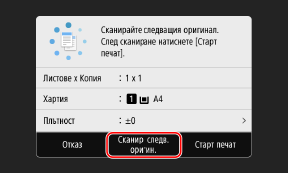 1 | Поставете следващия оригинал на стъклото за сканиране и натиснете [Сканир. следв. оригин.]. Следващият оригинал се сканира и се показва същият екран. Повтаряйте този процес, докато сканирането на всички оригинали приключи. Също така можете да натиснете [Плътност] и [Тип на оригинала], за да промените настройките за всеки оригинал. Ако размерът на оригинала е различен, част от изображението може да липсва или изображението може да бъде отпечатано умалено на хартията. |