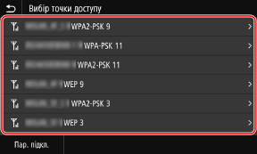 Знайдіть маршрутизатор безпроводової локальної мережі (точку доступу), до якого слід підключитися, і введіть ключ мережі. У разі підключення методом налаштування точки доступу встановлюються такі методи автентифікації та шифрування: метод автентифікації WEP: Open System; шифрування для WPA/WPA2: автоматично встановлюється протокол AES-CCMP або TKIP з урахуванням вибраного маршрутизатора безпроводової локальної мережі. Щоб указати інший метод автентифікації чи шифрування, підключіться за допомогою методу налаштування вручну. Підключення до безпроводової локальної мережі за допомогою налаштування даних (метод налаштування вручну) |