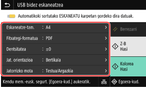 Eskaneatutako datuak USB memoria batean gordetzeko aukera ematen dute ezarpenek. Eskaneatutako datuak USB memoria batean gordetzeko prestatzea