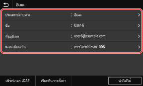 5 | กด [เริ่มการค้นหา] ผู้ใช้ที่ตรงตามเงื่อนไขการค้นหาจะปรากฏขึ้นมา เมื่อหน้าจอการรับรองความถูกต้องปรากฏขึ้น ให้ใส่ชื่อผู้ใช้และรหัสผ่านของเครื่องที่ลงทะเบียนไว้กับเซิร์ฟเวอร์ LDAP แล้วกด [นำไปใช้] |