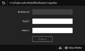 เมื่อตั้งค่าการส่งที่ผ่านการรับรองความถูกต้อง (LDAP Server Authentication) ไว้ หน้าจอเข้าสู่ระบบสำหรับการส่งที่ผ่านการรับรองความถูกต้องจะแสดงขึ้นเมื่อดำเนินการสแกนหรือส่งแฟกซ์ ใส่ชื่อผู้ใช้หรือรหัสผ่านที่ได้รับการจัดการด้วยเซิร์ฟเวอร์ LDAP เพื่อเข้าสู่ระบบ