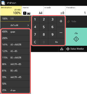 เลือกอัตราส่วนสำเนาแบบคงที่จากรายการ หรือใส่อัตราส่วนแบบกำหนดเองโดยใช้ปุ่มตัวเลข แล้วกด [ปิด].