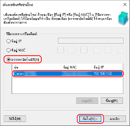 2 | เลือก [ตรวจหาอัตโนมัติ] และเครื่อง แล้วคลิก [ถัดไป] หากเครื่องไม่แสดงขึ้นมา ให้คลิก [ฟื้นฟู] หากเครื่องยังคงไม่แสดงขึ้นมาอีก ให้เลือก [ที่อยู่ IP] หรือ [ที่อยู่ MAC] ใส่ที่อยู่ IP หรือที่อยู่ MAC ของเครื่อง แล้วคลิก [ถัดไป] |