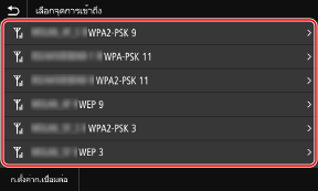 ค้นหาเราเตอร์ LAN แบบไร้สาย (จุดเข้าใช้งาน) ที่จะเชื่อมต่อ และใส่คีย์เครือข่าย เมื่อคุณเชื่อมต่อด้วยวิธีการตั้งค่าจุดเข้าใช้งาน วิธีการตั้งค่าการรับรองความถูกต้องและการเข้ารหัสจะถูกตั้งค่าดังนี้: วิธีการรับรองความถูกต้อง WEP: ระบบเปิด การเข้ารหัสสำหรับ WPA/WPA2: AES-CCMP หรือ TKIP ถูกตั้งค่าโดยอัตโนมัติตามเราเตอร์ LAN แบบไร้สายที่เลือกไว้ หากต้องการระบุวิธีการรับรองความถูกต้องหรือวิธีการเข้ารหัสอื่น ให้ใช้วิธีการตั้งค่าด้วยตนเองเพื่อเชื่อมต่อ การเชื่อมต่อกับ LAN แบบไร้สายโดยการตั้งค่ารายละเอียด (วิธีการตั้งค่าด้วยตนเอง) |