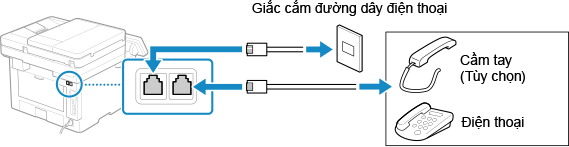 Kết nối dây điện thoại được cung cấp với giắc cắm đường dây điện thoại (LINE) trên máy và đầu nối đường dây điện thoại trên tường.