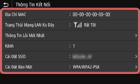 Ngoài địa chỉ MAC và thông tin kết nối của mạng LAN không dây khi máy được kết nối với mạng LAN không dây, bạn cũng có thể xem các cài đặt bảo mật.