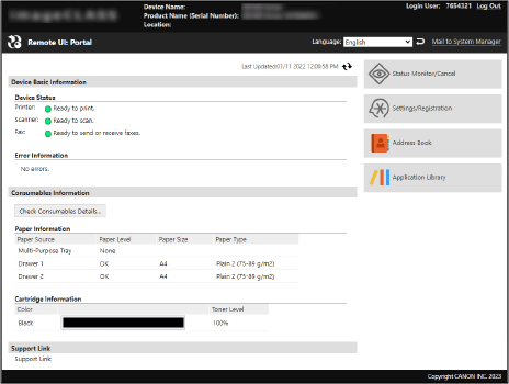 Apabila anda log masuk ke UI Jarak Jauh, halaman Portal (halaman teratas UI Jarak Jauh) muncul. Dari sini anda boleh memeriksa status operasi mesin, melihat pelbagai maklumat, dan menukar tetapan dengan operasi butang.