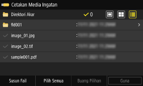 Untuk memilih semua fail yang dipaparkan, tekan [Pilih Semua] di bahagian bawah skrin. Jika terdapat kedua-dua fail PDF dan fail imej (fail JPEG atau TIFF), skrin untuk memilih jenis fail akan dipaparkan. Gunakan skrin ini untuk memilih jenis fail yang ingin dicetak.