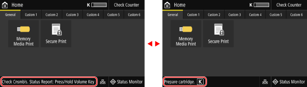 on the control panel. Use this screen to check the information of the machine, usage and logs, network settings, and error information. [Status Monitor] ScreenTouch Panel Model | Black and White LCD Model | |