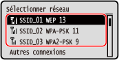 Préparez les informations du routeur du réseau local sans fil (SSID ou clé réseau) auquel vous voulez vous connecter et gardez-les à portée de main. Informations requises pour la connexion du routeur LAN sans fil Lors de la connexion à un routeur du réseau local sans fil prenant en charge la norme de sécurité WPA-EAP ou WPA2-EAP, définissez IEEE 802.1X. Utilisation d'IEEE 802.1X |