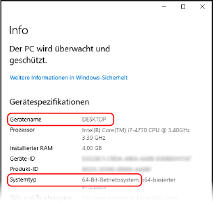 Wenn der Computer über ein 64-Bit Betriebssystem verfügt, wird "64 Bit-Betriebssystem" angezeigt.