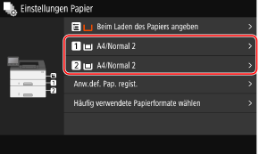 Wählen Sie auf dem Bedienfeld im Bildschirm [Startseite] die Option [Einstellungen Papier], und drücken Sie dann