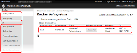 Klicken Sie auf [Auftragsnummer] für angehaltene Drucke und gesicherte Drucke, um die Druckdetails anzuzeigen sowie den Benutzernamen und die Anzahl der gedruckten Blätter anzusehen.