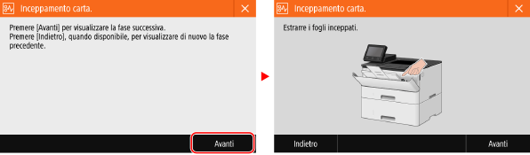 Viene visualizzato un messaggioViene visualizzato un codice di erroreEsempio di visualizzazione: Quando si verifica un errore Modello con touchpanel Modello con LCD bianco e nero |