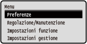 Questa schermata viene visualizzata quando si preme [Menu] nella schermata [Schermata princip.]. Utilizzare questa schermata per configurare le varie impostazioni della macchina.