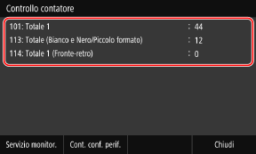 Operazioni disponibili nella schermata Controlla contatoreLe voci visualizzate sullo schermo variano in base al paese o all'area geografica. Premere [Servizio monitor.] per verificare la connessione al server di monitoraggio. Eseguire questa operazione per inviare le informazioni della macchina al server di monitoraggio con regolarità. Premere [Cont. conf. perif.] per verificare la configurazione di opzioni sulla macchina.