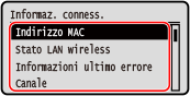 Oltre all'indirizzo MAC e alle informazioni di connessione della LAN wireless, quando la macchina è connessa a una LAN wireless, è possibile vedere anche le impostazioni di sicurezza.