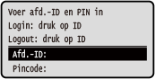 Als het Beheer afdelings-id is ingesteld, verschijnt het volgende inlogscherm. Voer het Afdelings-id in om in te loggen. Als er een pincode is ingesteld, voer die dan in.