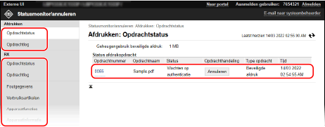 De status van alle afdruktaken wordt weergegeven, ongeacht de instellingen van Beheer afdelings-id.