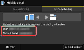 1 | Controleer de SSID en netwerksleutel van het apparaat die worden weergegeven op het tabblad [Directe verbinding]. |
