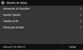 . Utilize este ecrã para verificar informações sobre a máquina, utilização e registos, definições de rede e informações de erro. Ecrã [Monitor de Status]|