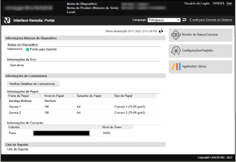 Quando inicia sessão na IU remota, aparece a página do portal (página superior da IU remota). Aqui, pode verificar o estado de funcionamento da máquina, visualizar várias informações e alterar as definições com o botão de operações.
