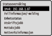 på kontrollpanelet. Bruk dette skjermbildet til å sjekke informasjonen for maskinen, bruk og historikk, nettverksinnstillinger og feilinformasjon. Skjermbildet [Statusovervåking]Modell med berøringspanel | Svart-/hvit LCD-modell | |