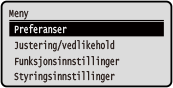 Endre skjermbildeDu kan endre skjermbildene på kontrollpanelet som ved å endre språk og enheter, eller vise og skjule meldinger. [Displayinnstillinger] Du kan invertere fargene på skjermen og justere lysstyrken slik at det er lettere å se på skjermen. [Tilgjengelighet] Slette innstillinger automatiskSom standard vil innstillingene som konfigureres på skjermen bli slettet hvis det ikke utføres noen handlinger etter et bestemt tidsrom, og skjermbildet [Hjem] vises. Du kan endre tidsrommet før innstillingene slettes og skjermbildet vises. [Auto-nullstillingstid] [Funksjon etter auto-nullstilling] |