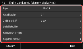 Du kan endre standardinnstillingene for funksjonen minnemedia-utskrift, som hentes opp ved bruk av kontrollpanelet.