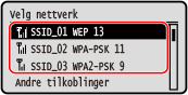Søk etter en trådløst LAN-ruter (tilgangspunkt) som det skal kobles til, og angi nettverksnøkkelen. Når du kobler til med tilgangspunktmetoden, stilles følgende godkjenning- og krypteringmetodene inn: WEP-godkjenningsmetode: Åpent system Kryptering for WPA/WPA2: AES-CCMP eller TKIP stilles automatisk inn i henhold til valgt trådløst LAN-ruter. Hvis du vil angi en annen godkjenning- eller krypteringmetode, kan du bruke den manuelle oppsettmetoden når du kobler til. Koble til et til trådløst LAN ved å angi informasjonen (manuell oppsettmetode) |