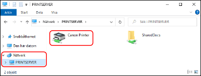 I [Nätverk] ska du välja utskriftsservern för att visa den delade skrivaren.