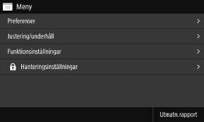 Ändra skärminställningarDu kan ändra inställningarna för hur kontrollpanelen visas. Du kan t.ex. ändra språk och måttenheter samt visa eller dölja meddelanden. [Skärminställningar] Du kan invertera färgerna och ändra ljusstyrkan för att det ska vara lättare att läsa på skärmen. [Hjälpmedel] Ta bort inställningar automatisktOm ingen åtgärd har utförts under en viss tidsperiod är standardinställningen att angivna inställningar på skärmen tas bort och skärmen [Hem] visas. Du kan ändra tiden tills inställningarna tas bort och nästa skärm visas. [Autoåterställning av tid] [Funktion eft. autoåterställn.] |