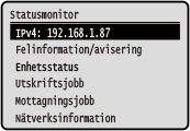 på kontrollpanelen. Använd den här skärmen när du vill kontrollera information om enheten, användning och loggar, nätverksinställningar samt felinformation. Skärmen [Statusmonitor]Pekskärmsmodell | Svartvit LCD-modell | |